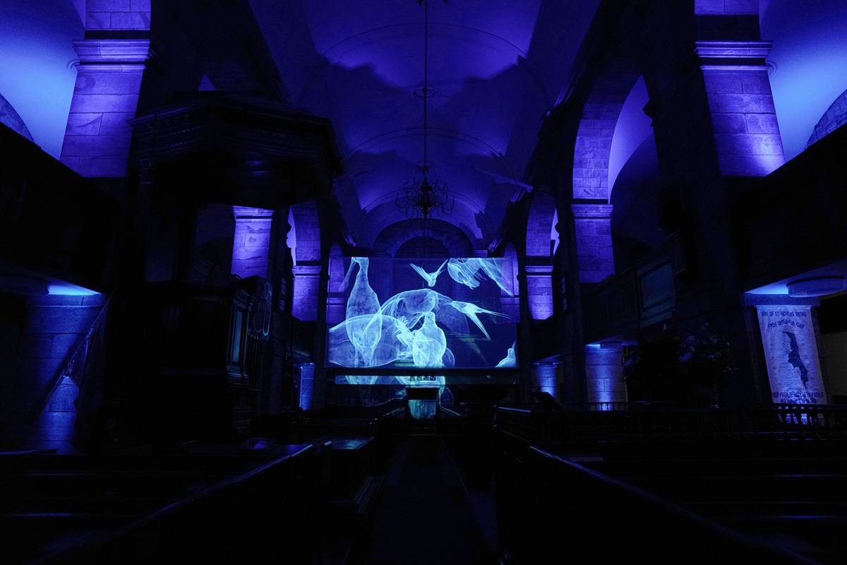 Update February 2020: Aerial was shown as part of Spectra, Aberdeen’s Festival of Light in February 2020. The installation was adapted to be shown in the Kirk of St Nicholas and included a specially choreographed lighting scheme to complement the film projection. Visitors were able to enjoy Aerial from the comfort of the church pews. This link here shows a short film clip of the work in situ (first 20 seconds), and the images here show the work in situ in the church.