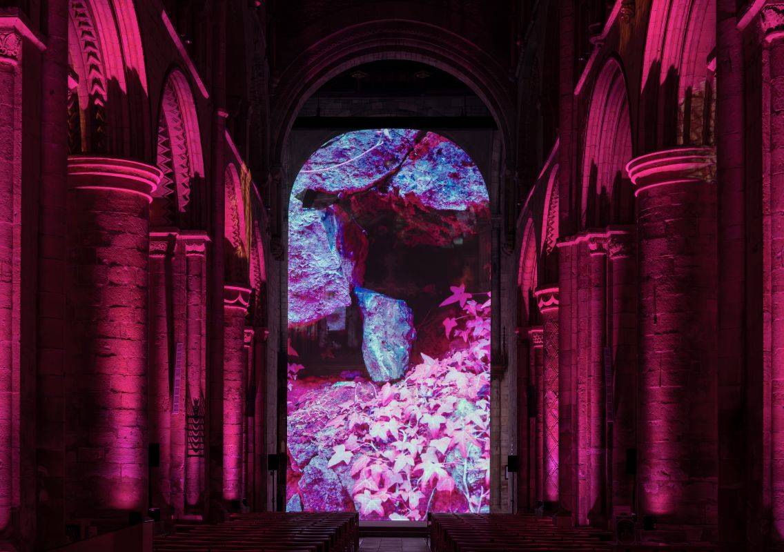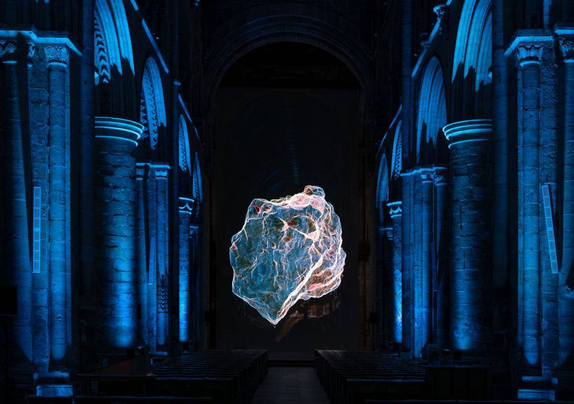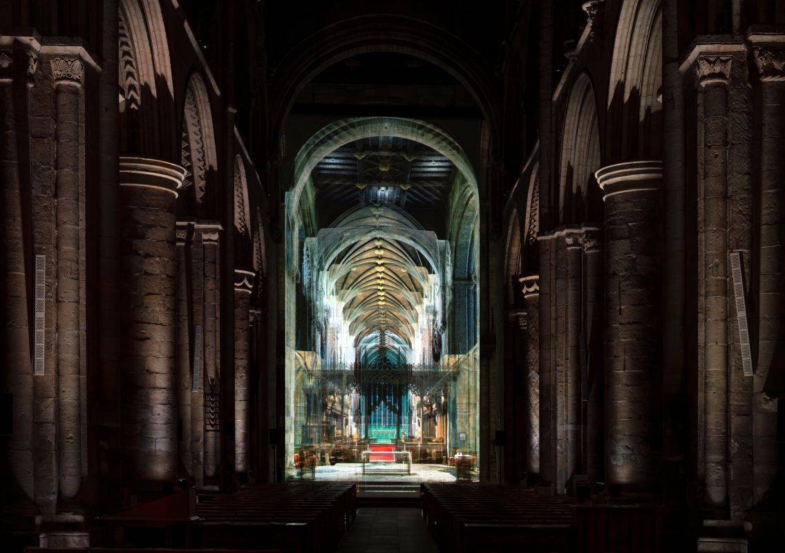 Ancient Futures is a large-scale video, light and sound installation developed in response to Selby Abbey and the local limestone from which the church is built. Founded in 1069, the Abbey originates from an otherworldly vision received by St Germain to build a monastery in “Selebiae”, where three swans meet on a river bend.
