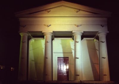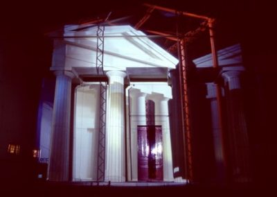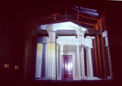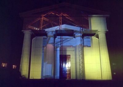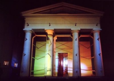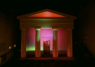 The Greek Revival facade of the Unitarian Church provided a strong architectural and stylistic framework with which to work. The symbolic nature of this facade could be subverted then reinforced as key elements such as the pillars and architrave were altered or pulled apart. The three dimensional qualities of the facade were utilised to create a series of spaces and structures that appeared animated as the viewer walk passed.