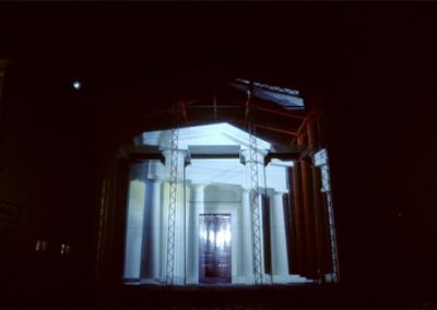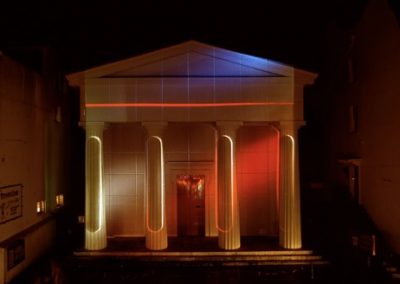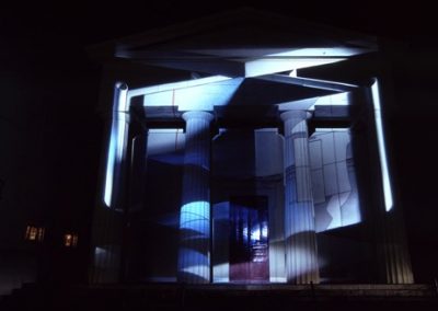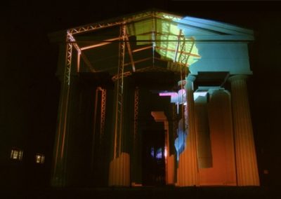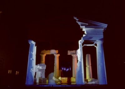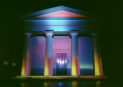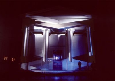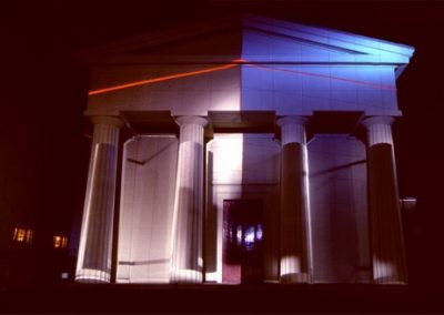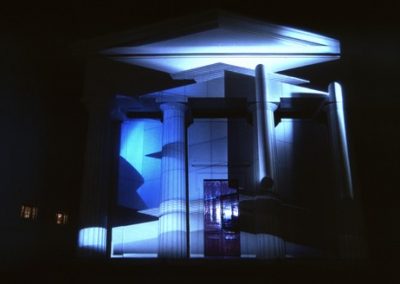 The title Fastbuild referred to a building technique where architectural facades and styles are used to clad steel frames. Architectural features such as pillars and pediments may only bear symbolic weight rather than having a structural function. These ideas are synonymous with Fastbuild and the ambiguous nature of light projection as a material to build an architectural illusion.