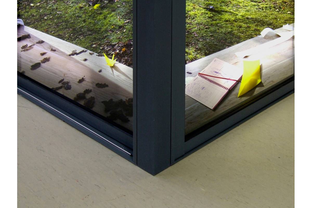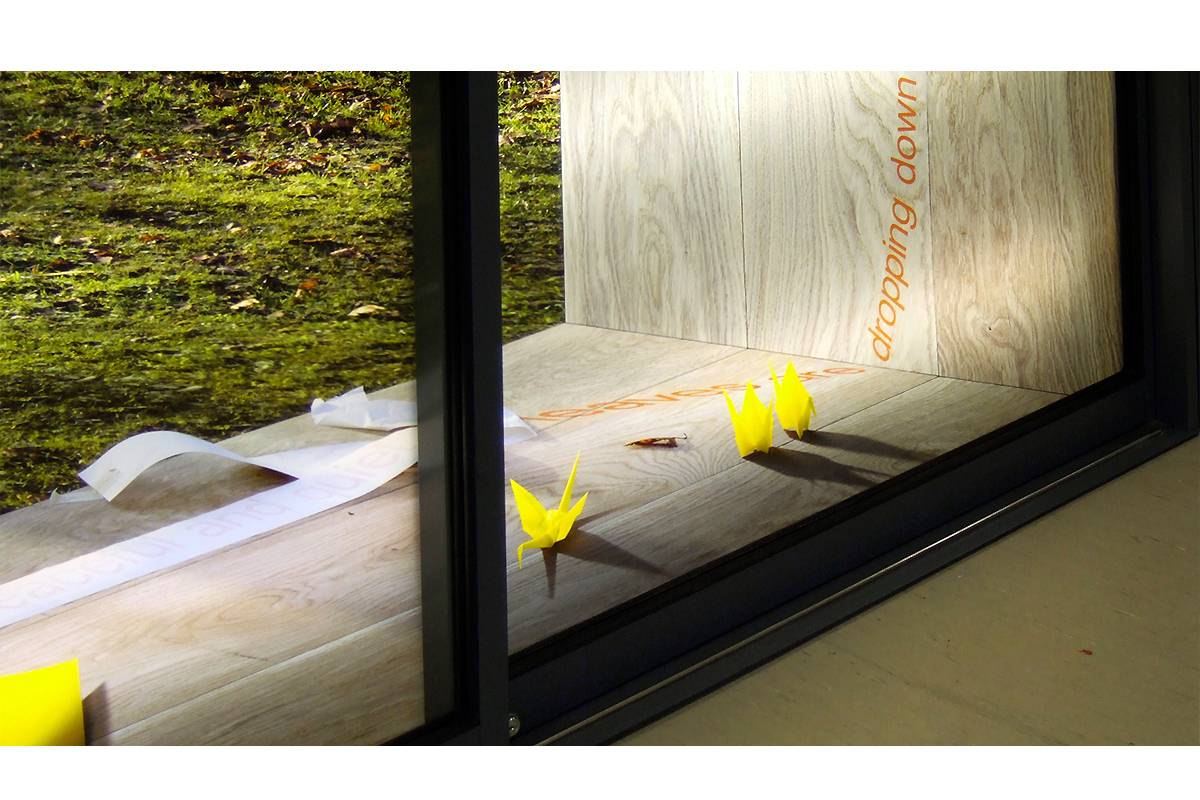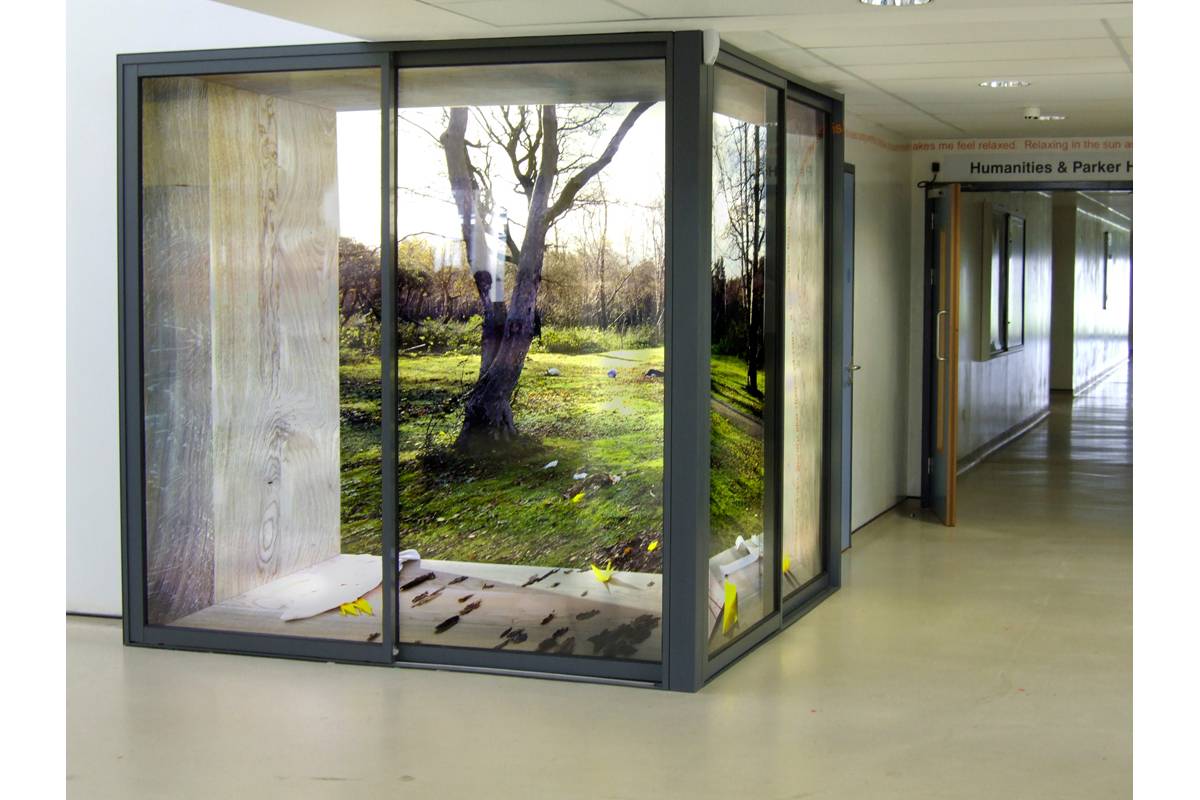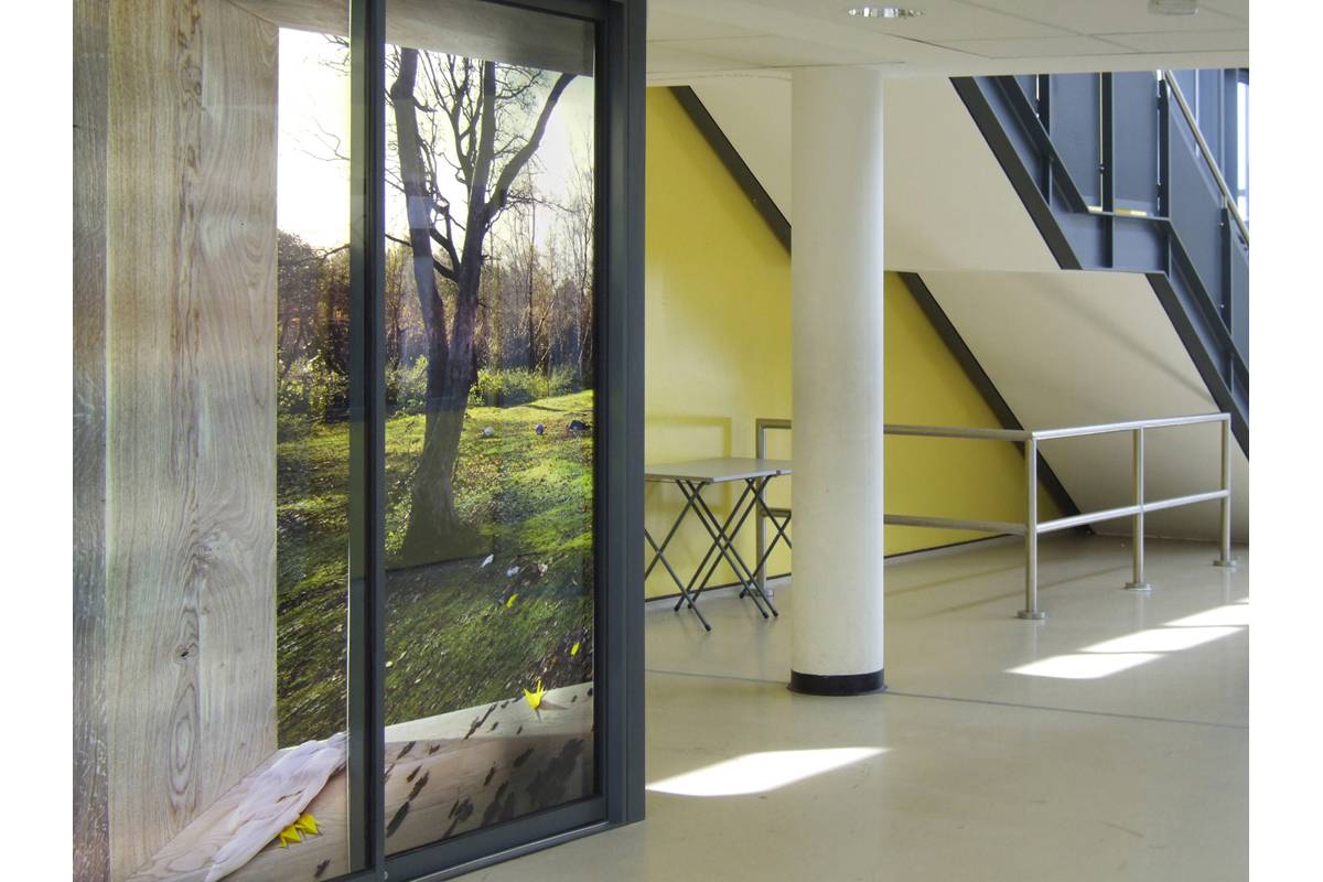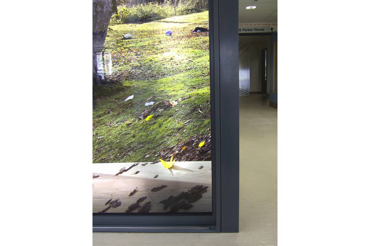 Poets’ Corner creates a virtual opening into Tilgate Forest through a corner wall in the main atrium of the college. The scene is created by a large back-lit Duratran photograph housed behind two sets of sliding doors, inviting the viewer to step through into the virtual space beyond. The image is printed at high resolution so that tiny details, including a trail of yellow origami birds, slowly unfolding into the background, may be discovered over time.
